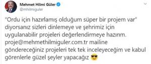 için onlarında fikirlerini almak için kişisel sosyal medya hesaplarımızdan bir çağrı yapmıştık. Aradan geçen kısa süre içinde toplam 478 adet proje bizlere ulaştı. Her bir projeyi alanlarında uzman arkadaşlarımız kategorilere ayırıyorlar. İlimiz için ilçelerimiz için uygun görülen projeler ve proje sahipleri ile tek tek görüşeceğiz. Her zaman söylediğimiz gibi, Düşünen Ordu Üreten Ordu ve Yarışan Ordu’yu inşallah başlatıyoruz”