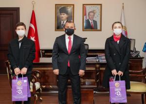Vali Tuncay Sonel, Aile Çalışma ve Sosyal Hizmetler Bakanlığı tarafından gençlerde var olan milli tarih şuurunun daha da geliştirilmesi, vatan ve bayrak sevgisinin pekiştirilerek gelecek kuşaklara aktarılması amacıyla 81 ilde hayata geçirilen “Anadolu Gönül Yolu 81 Genç 81 Bayrak” etkinliği kapsamında düzenlenen devir teslim töreninde ay yıldızlı bayrağı ilimize ulaştıran Sibel Sarıaydın ile bayrağı teslim alan Azmi Çağlar adlı öğrencileri tebrik ederek, çeşitli hediyeler verdi.