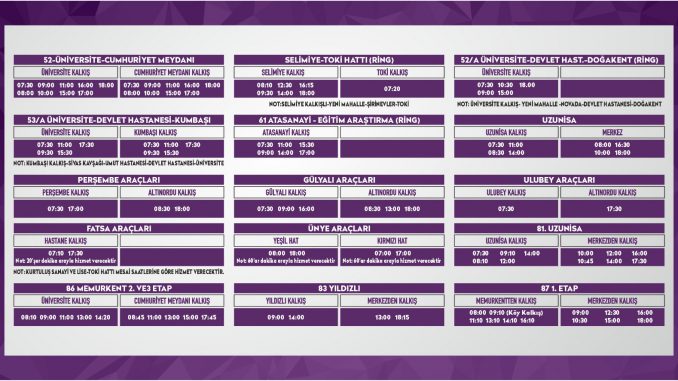 *Fatsa Araçları Hastahane Kalkış: 07:10 ile 17:30 arasında ( 20’şer dakika arayla karşılıklı hizmet verecek) Ayrıca, Kurtuluş Sanayi ve Lise-Toki Hattı mesai saatlerine göre hizmet verecektir.