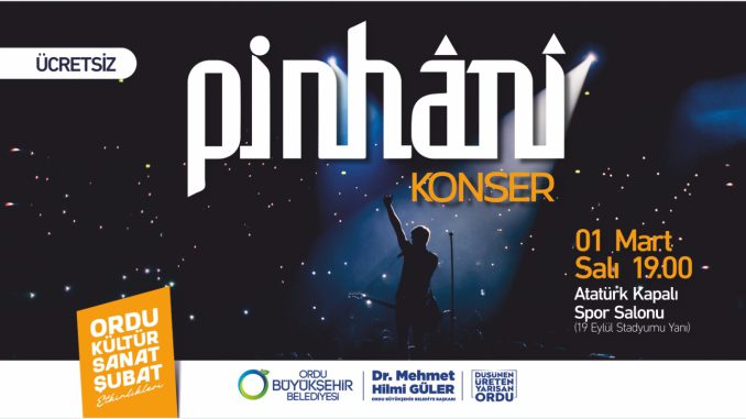 “Dünyadan Uzak”, “Dön Bak Dünyaya”, “Ne Güzel Güldü”, “Beni Al”, “Hele Bi Gel” ve “Ben Nasıl Büyük Adam Olucam” gibi pek çok beğenilen şarkıların seslendirileceği “Pinhâni” konseri 1 Mart Salı günü saat 19.00’da Ordu Atatürk Kapalı Spor Salonunda gerçekleştirilecek.