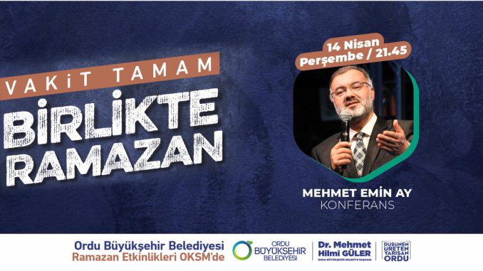 Ordu Büyükşehir Belediyesi Kültür, Turizm ve Sanat Dairesi Başkanlığı tarafından hazırlanan Ramazan ayı kültür sanat etkinlikleri devam ediyor. Ordu Kültür Sanat Merkezi’nde iftar sonrası çocuklar ve aileler için etkinlikler gerçekleştiren Büyükşehir Belediyesi, İlahiyatçı, müzisyen Mehmet Emin Ay’ın katılımı ile bir konferans düzenleyecek.