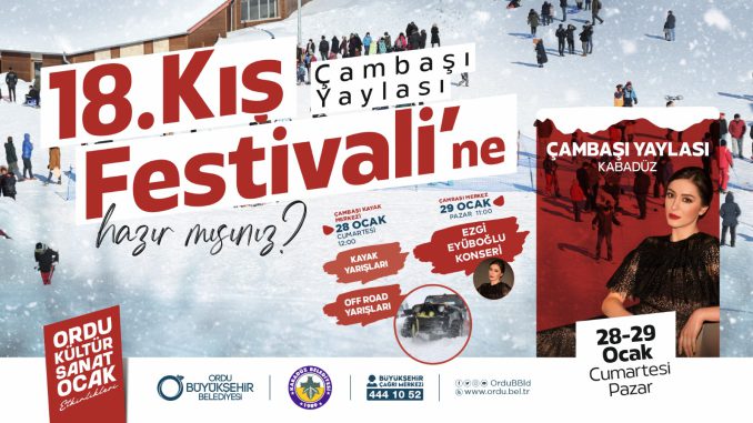 Bu kapsamda Ordu Büyükşehir Belediyesi ve Kabadüz Belediyesi iş birliğinde 28-29 Ocak tarihlerinde Kabadüz ilçesi Çambaşı Yaylası’nda 18. Kış Festivali gerçekleştirilecek. Birbirinden renkli görüntülerin sahne alacağı ve çeşitli ikramların yapılacağı festivalde vatandaşlar unutulmaz bir hafta sonu geçirecek.